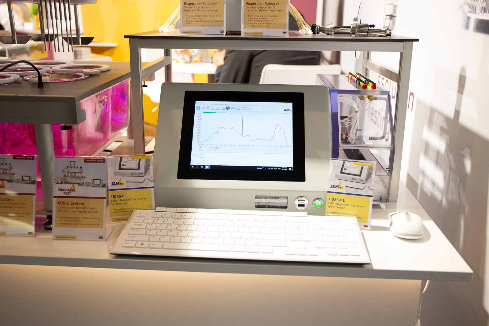 Highlights: ADS-L 1420 online automated dissolution »closed loop« testing system (on the left) and PTG-NIR the powerful powder analysis system (on the right). Both systems including the powerhouse spectrometer TIDAS® L from J&M
