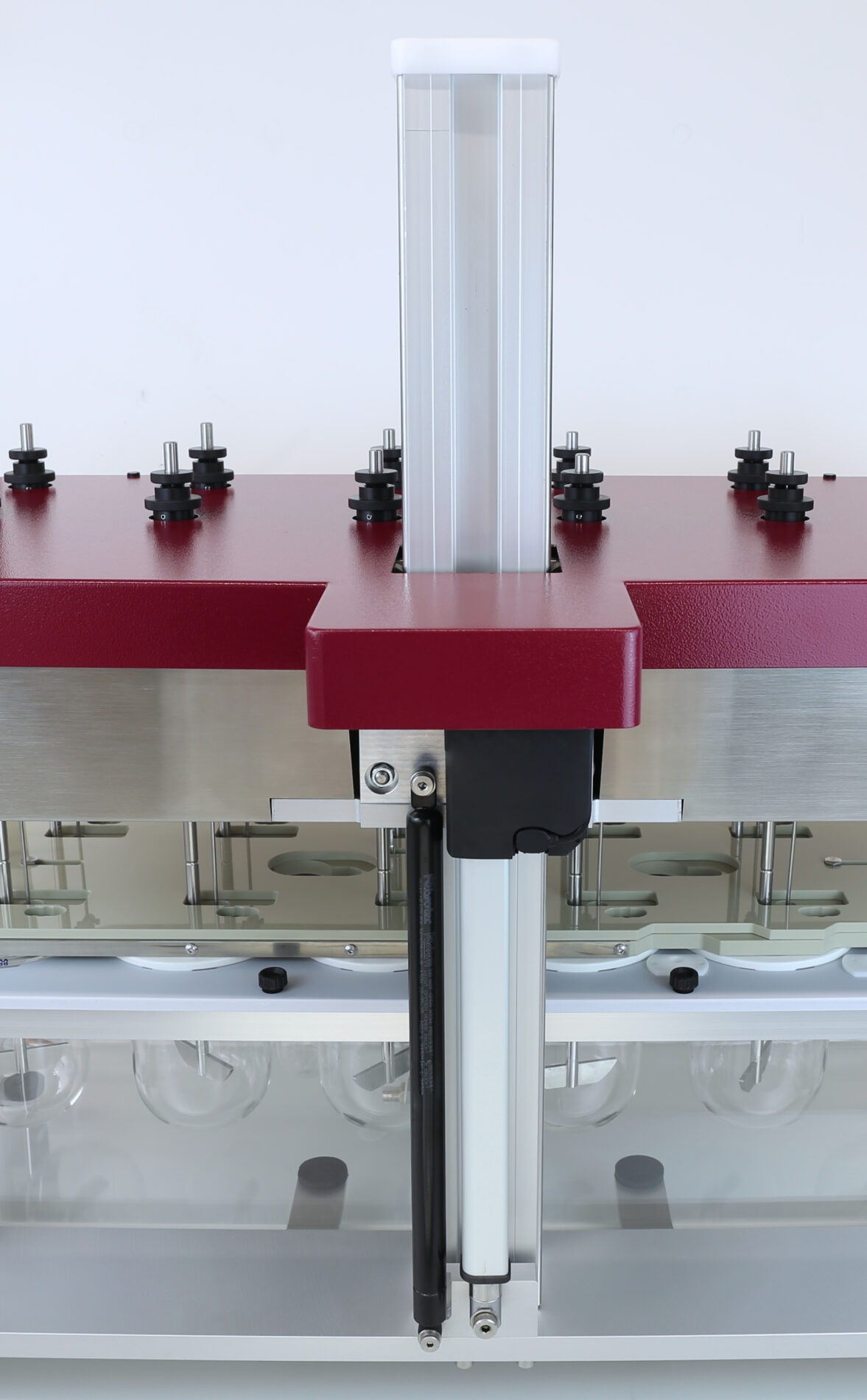 The PTWS 1230 and PTWS D630 instruments are equipped with a re-engineered electronic lifter design. This system consists of a rigid, stationary lift column fitted with bearings to support the instrument head. Movement of the instrument head is managed by a linear actuator, which lifts the head, aided by a gas pressure spring. When lowering, the linear actuator operates without force, allowing the head to descend gently under its own weight, counterbalanced by the gas pressure spring. The positioning of the head is still controlled electronically. This design minimizes the risk of damage from obstructions between the instrument head and the water bath.