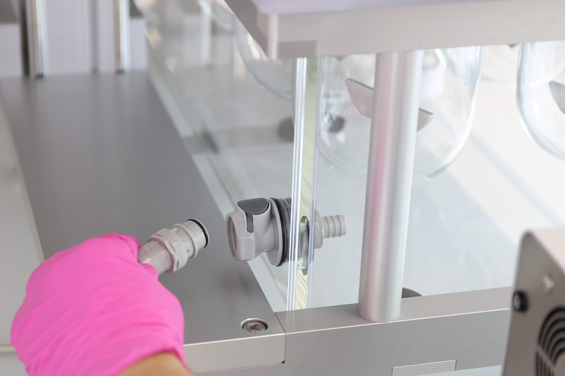 The water bath has been completely redesigned to enhance stability and durability. A newly developed quick-connector system ensures secure, leak-free attachment of the heater module to the water bath. In addition, the tubing has been upgraded with a larger internal diameter, enabling significantly improved water circulation. As a result, the flow rate of the new instruments is now double that of previous models, eliminating the need for a water diffuser inside the bath.
